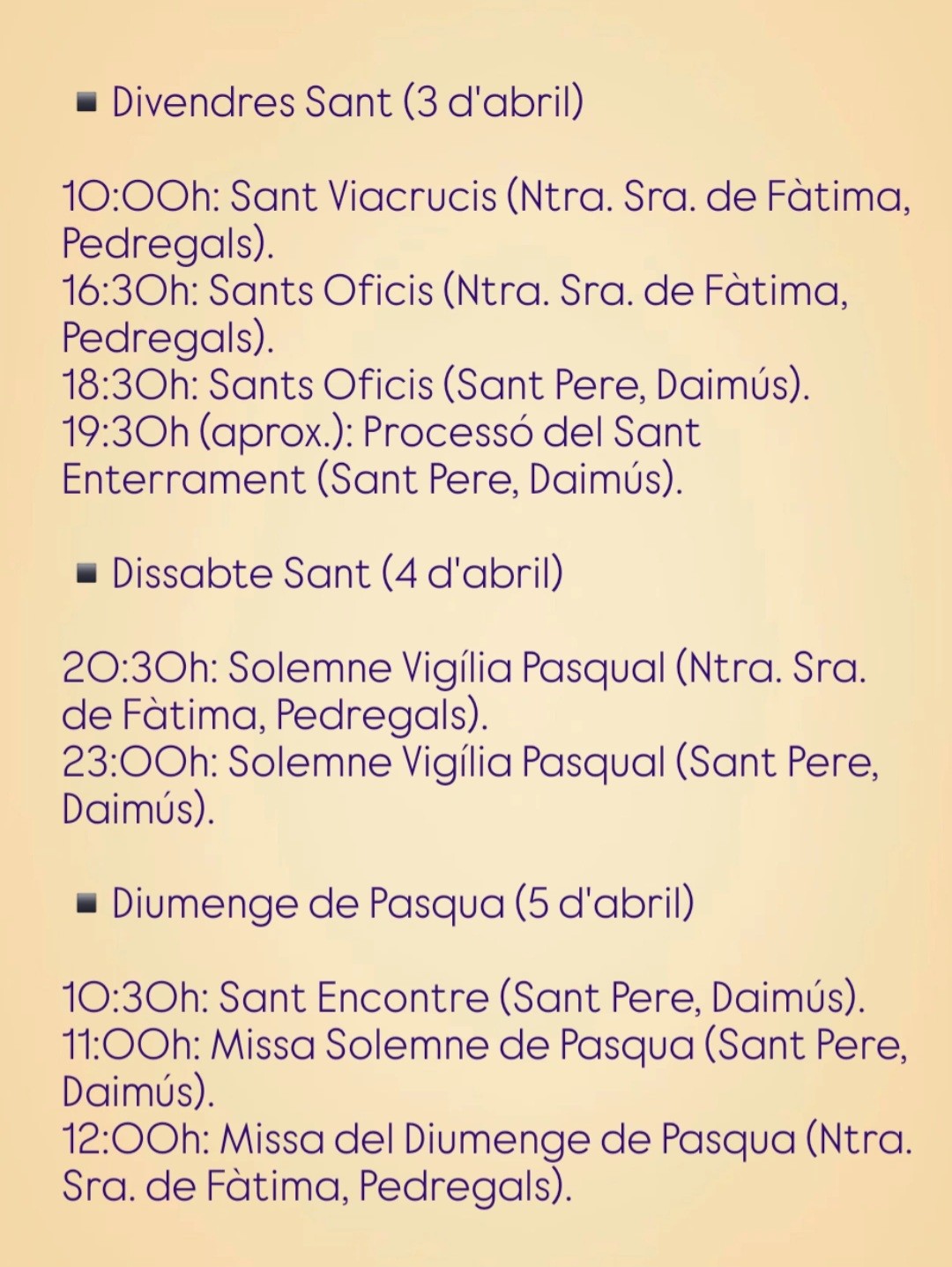 Las celebraciones se desarrollarán en la Parroquia de San Pedro y en la Iglesia de Nuestra Señora de Fátima en Els Pedregals, incluyendo procesiones y actividades religiosas para toda la comunidad