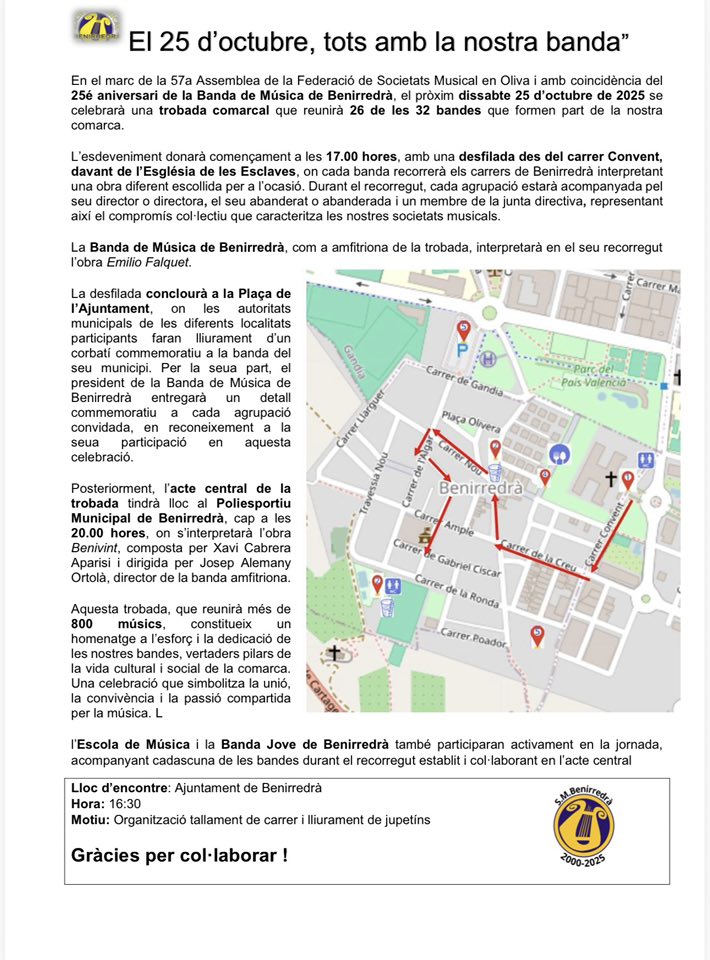 8.º Encuentro de Bandas Safor-Valldigna y 25.º aniversario de la Sociedad Musical de Benirredrà