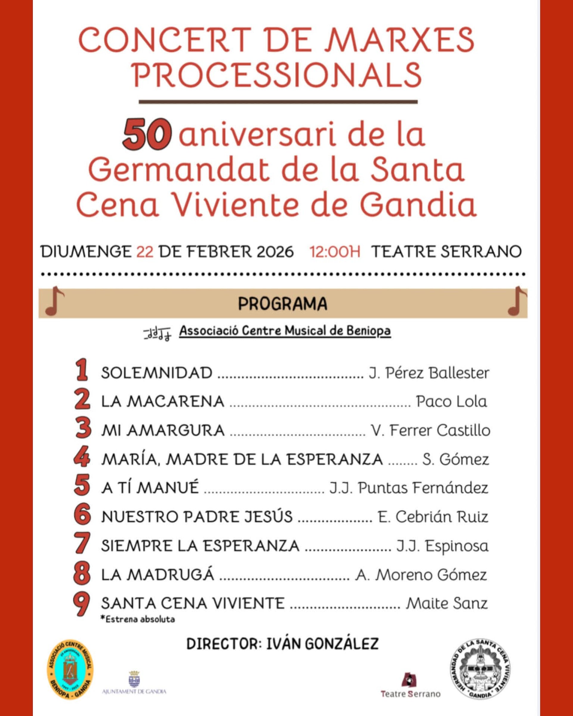 El Teatro Serrano alberga este domingo 22 de febrero a las 12:00 horas una actuación de la Asociación Centre Musical de Beniopa, en la que se estrenará una marcha compuesta para la ocasión por la música Maite Sanz
