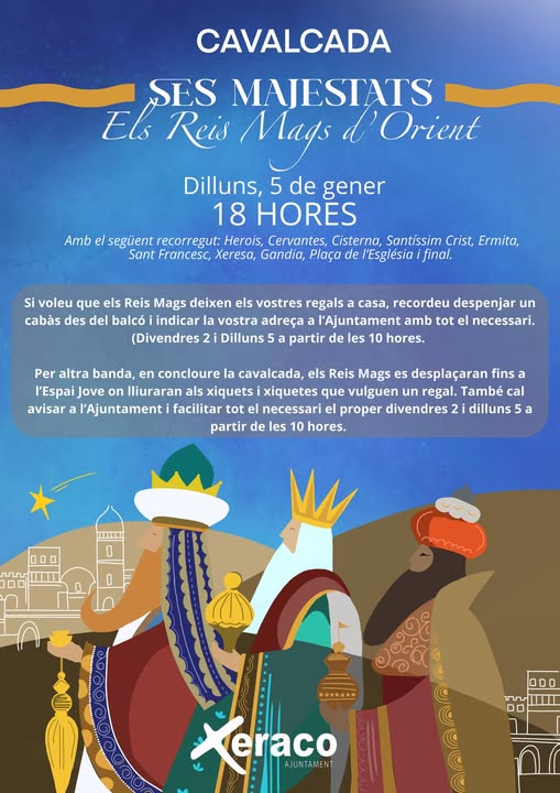 El lunes 5 de enero a las 18:00 h tendrá lugar la tradicional cabalgata, con reparto de regalos durante y después del recorrido