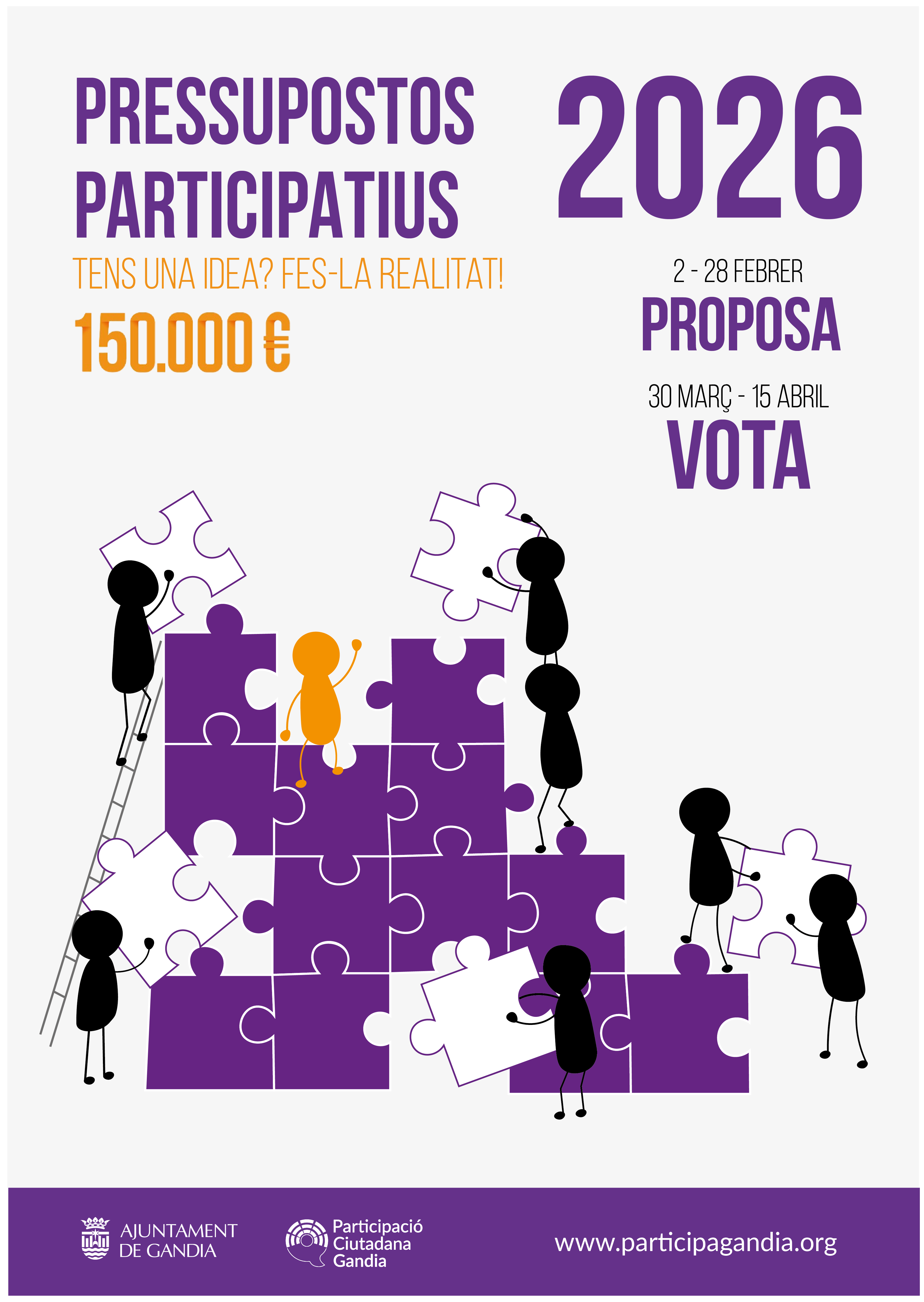 El proceso participativo arrancará con la presentación de propuestas, que estará abierta desde hoy 2 de febrero y hasta el 29 de febrero a través de la web participagandia.org (ir a la web). A continuación, durante el mes de marzo, se llevará a cabo la valoración técnica de todas las iniciativas recibidas, seleccionando aquellas que sean viables y de mayor interés para la ciudad. Finalmente, entre el 30 de marzo y el 15 de abril, los vecinos podrán participar en la votación final para decidir cuáles serán las tres propuestas que se ejecutarán.
