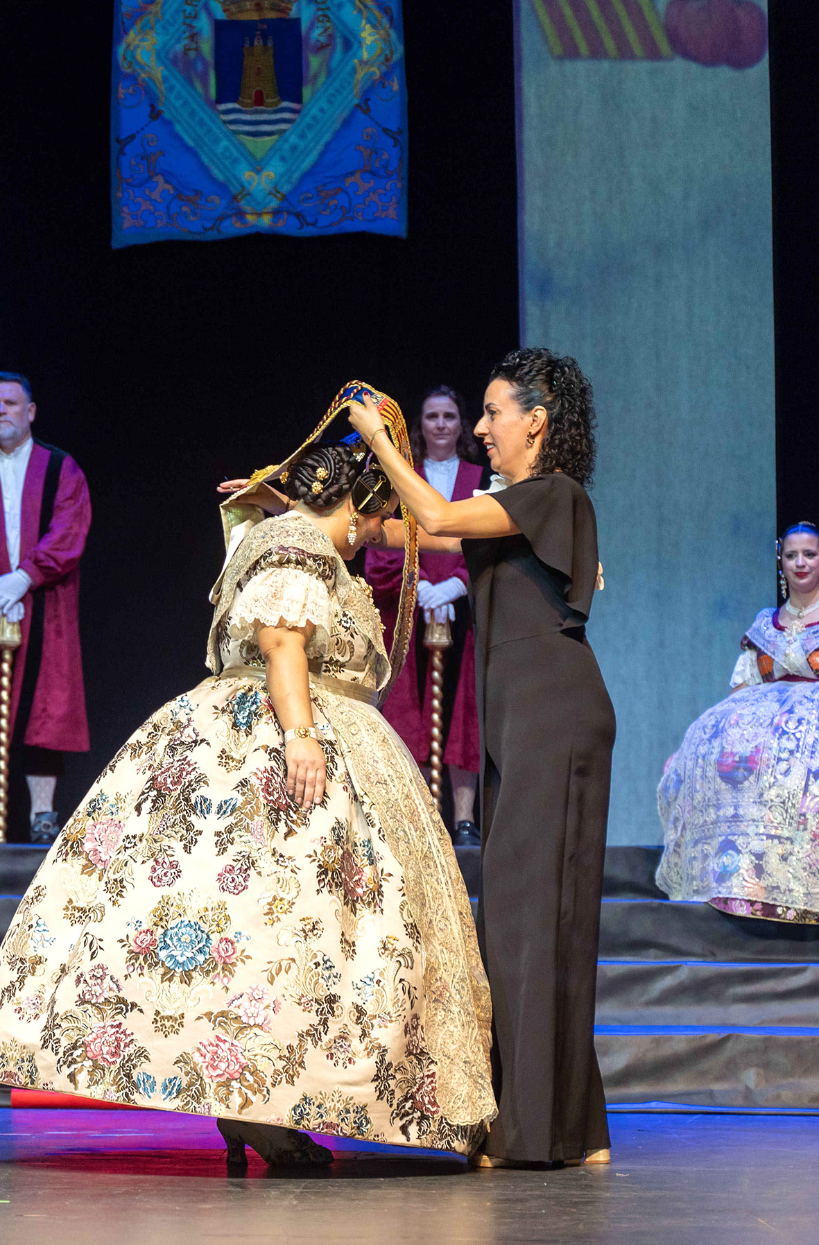 Ya en el acto de la Casa de la Cultura, la alcaldesa de Tavernes impuso a Isabel Gimeno la banda que la acredita como máxima representante de las Fallas valleras.