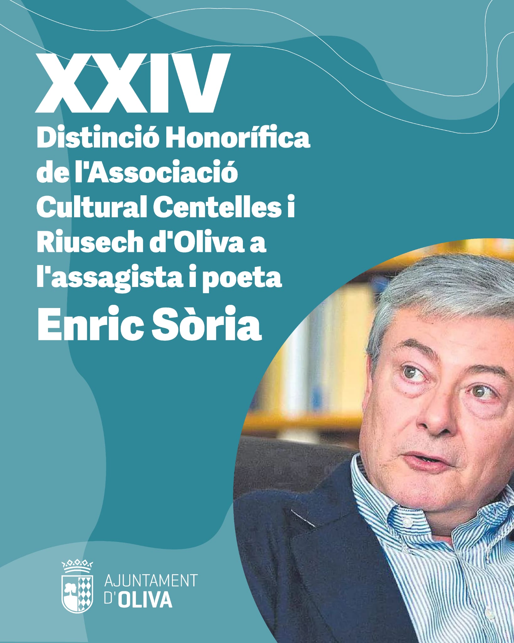 La asociación cultural Centelles y Riusech de Oliva ha decidido otorgar, con la colaboración de la concejalía de Cultura, su XXIV Distinción Honorífica, correspondiendo al año 2025, al escritor local Enric Sòria Parra. Con este galardón, la asociación premia su contribución a la literatura valenciana.