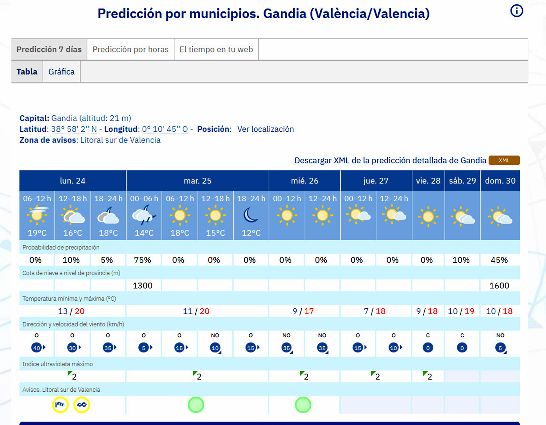 Así las cosas, para hoy lunes 24 de noviembre de 2025 y onomástica de Santa Flora y Sanya María de Córdoba, la Agencia Estatal de Meteorología (Aemet) ha previsto que, en la Safor tengamos cielo con intervalos nubosos.