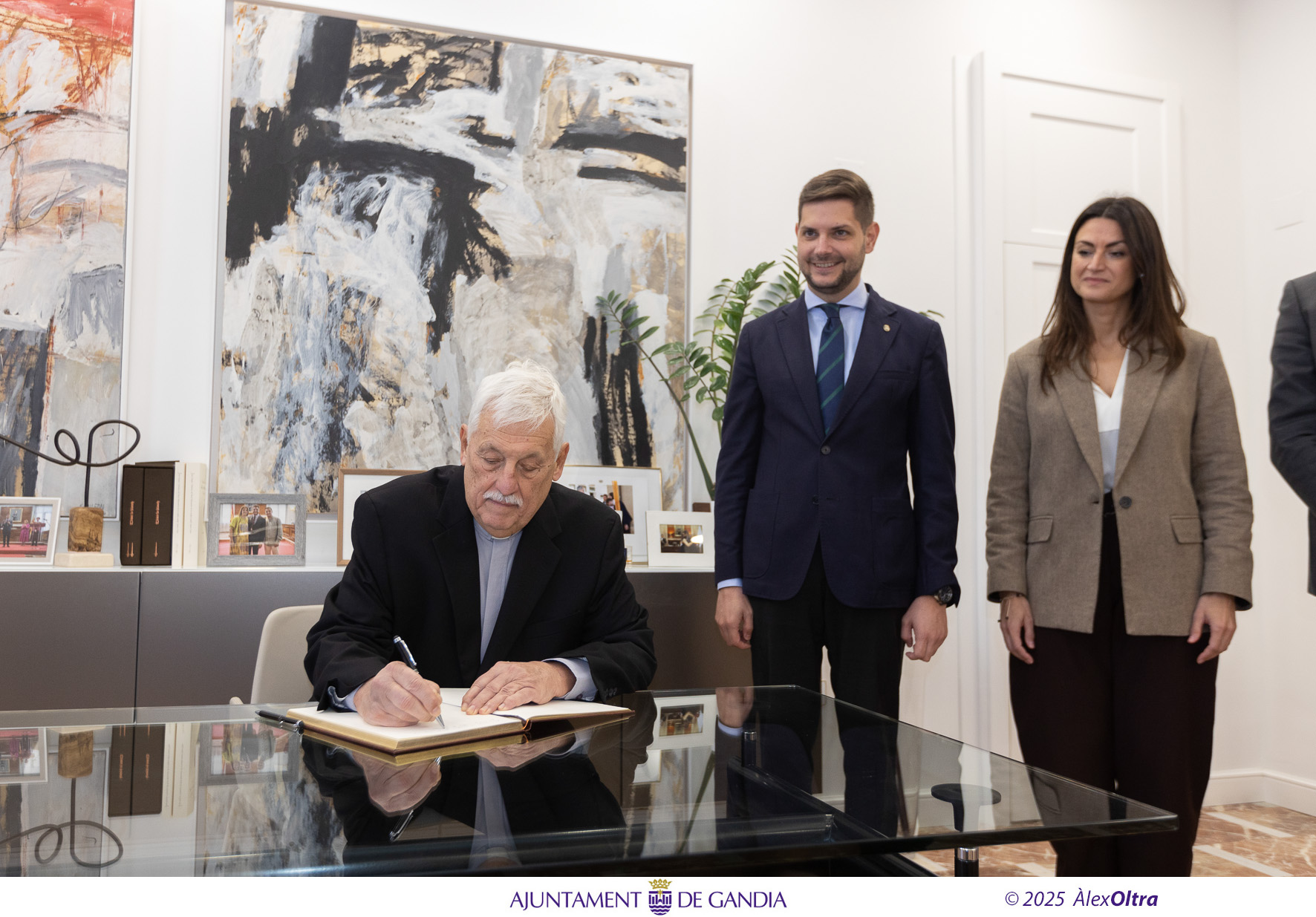 Durante el encuentro, celebrado en el despacho de alcaldía, el Superior General de la Compañía de Jesús ha firmado en el Libro de Honor de la Ciudad, y el alcalde le ha hecho entrega de un obsequio institucional, el tradicional azulejo con la doble corona de la Familia Borja en nombre de la ciudad, como muestra de agradecimiento por su visita y por la estrecha vinculación histórica entre Gandia y la Compañía de Jesús.