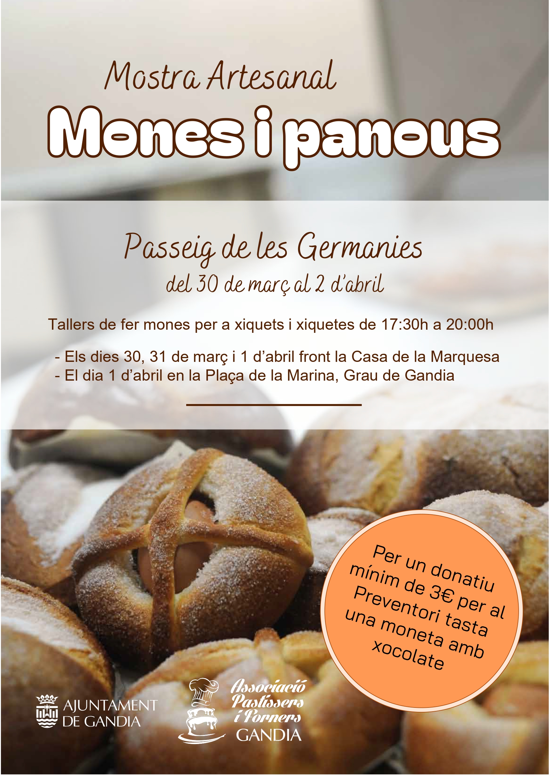 ¿Panquemado o Panou; Mona o Reganyà? Son términos artesanales y productos en peligro de extinción por las grandes superficies y donde hoy, las manos de los pasteleros y panaderos de Gandia han reivindicado, una vez más, el producto de proximidad y de calidad. Como en casa, nada. La muestra tendrá lugar de lunes a jueves con degustación y venta de dulces tradicionales. Los talleres infantiles destinarán la recaudación íntegra al Preventorio.