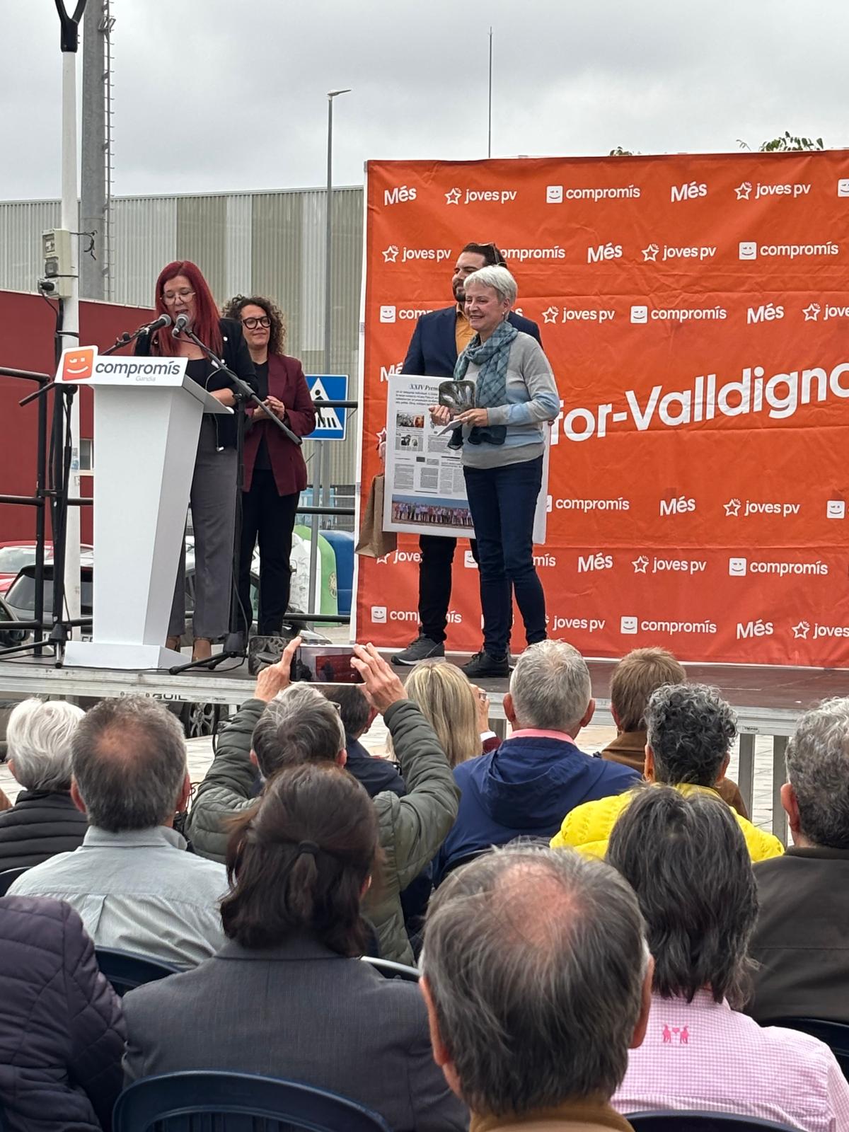 En la categoría individual, el galardón fue para Lluïsa Parra i Vercher, de Oliva, en reconocimiento en toda una vida dedicada en la educación, la lengua y el valencianismo. Docente, licenciada en Filología Catalana, escritora o ex regidora, Parra ha sido una figura clave en la defensa del valenciano desde el ámbito educativo y asociativo, así como en la participación activa en diferentes espacios políticos e institucionales del valencianismo. Su trayectoria, vinculada también al feminismo, el municipalismo y a entidades culturales como lo CEIC Alfonso el Viejo, ejemplifica el compromiso sostenido con el territorio, la lengua y la construcción de un País Valenciano más justo y cohesionado. La portavoz de Compromís en el Ayuntamiento de Oliva, Yolanda Navarro, estuvo la encargada de presentar el galardón.