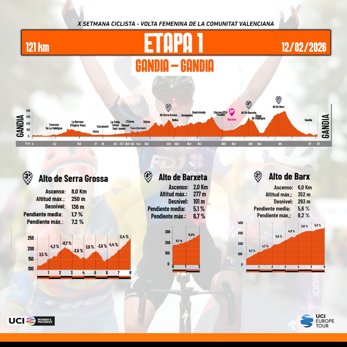 La salida neutralizada tendrá lugar mañana a las 14 horas en la avenida de la República Argentina cruce con la calle del Cardenal Cisneros. Las ciclistas y la caravana saldrá en dirección a Xeraco por la N-332. La hora prevista de llegada a la meta será entre las 17.12 y las 17.31 horas procedentes de Xeraco por la misma N-332.