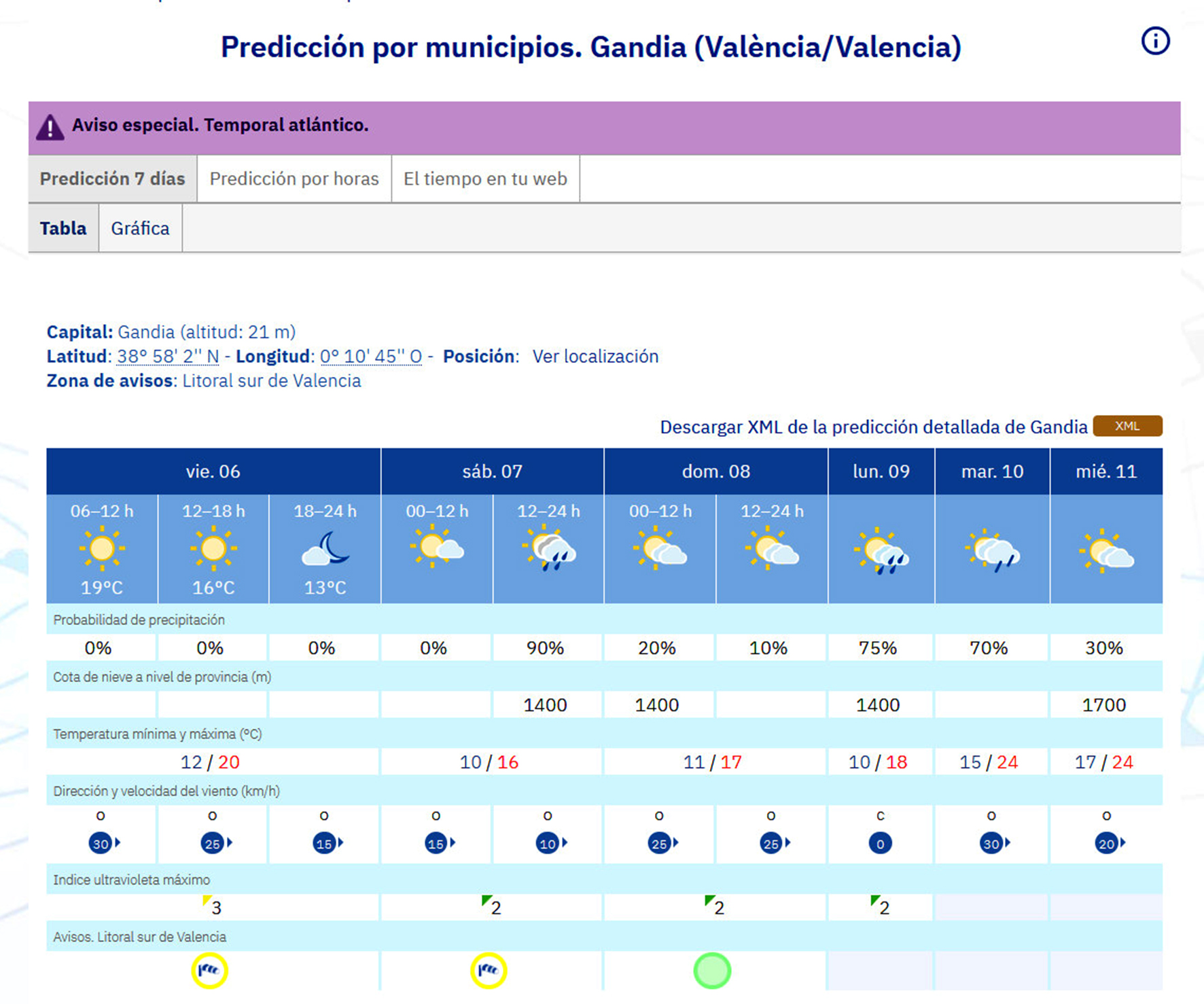 Así las cosas, para este sexto día del segundo mes del año 2026 y onomástica de Santa Dorotea de Capadocia, patrona de los Floristas, la Agencia Estatal de Meteorología (Aemet) ha previsto que, en la Safor, tengamos cielo cielo poco nuboso aumentando por la tarde a nuboso, con probabilidad de precipitaciones débiles y dispersas en el interior.