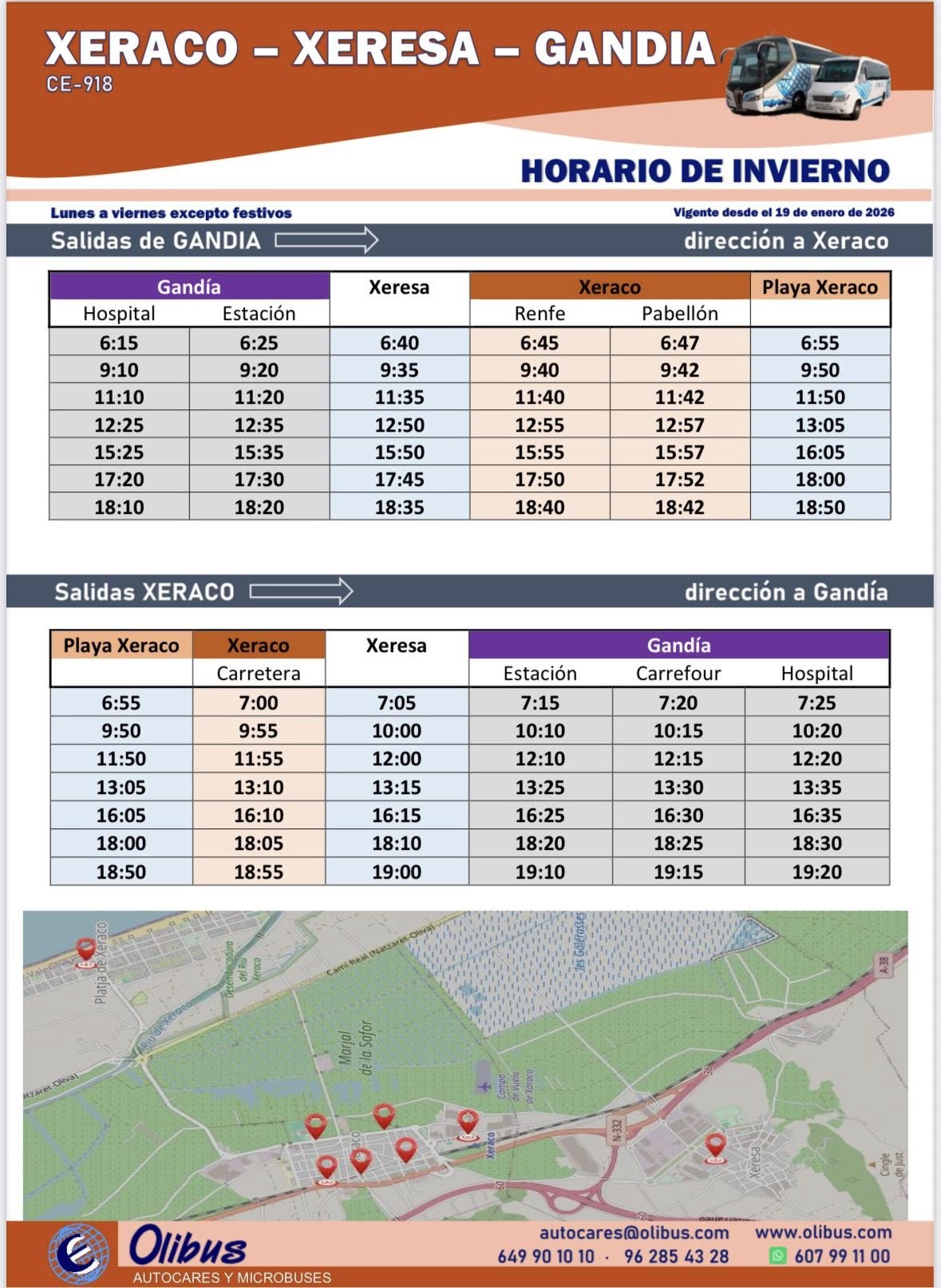 El trayecto subvencionado por la Diputación es la línea regular Playa de Xeraco-Xeraco-Xeresa-Gandia y viceversa. Consulta aquí las salidas desde Xeraco o desde Gandia, así como las paradas y horarios.